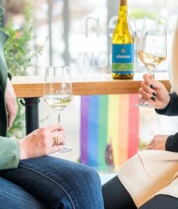 The "vin gris" (white wine made from dark-skinned grapes) has almost as much color as a rose, with unique flavors for a totally new wine experience. Fruity/dry; medium plus acid.